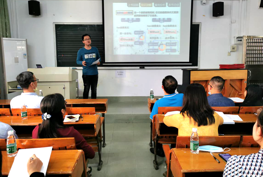 比赛开始前,广东省第五届高校青年教师教学大赛一等奖获得者郝刚老师从导入、分析、案例、总结四个方面给所有师生讲授了一堂示范课程。