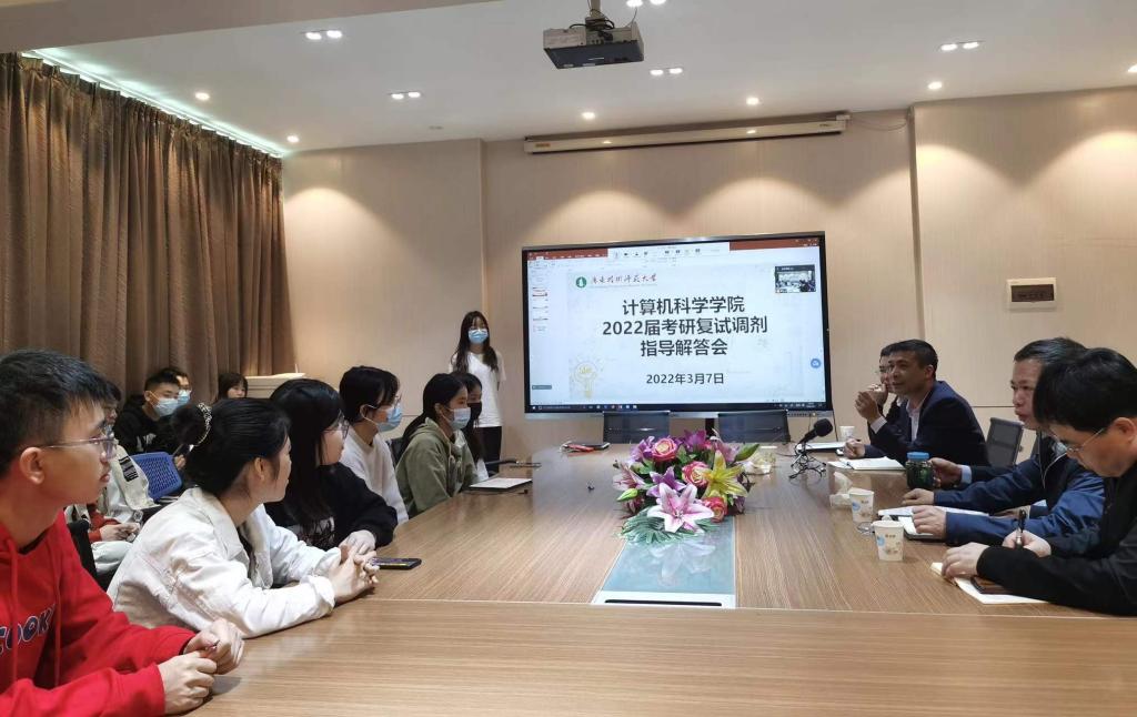 交流会上,赵慧民向同学们详细讲解了考研调剂的相关政策,重点介绍了计科院的科研优势和团队实力,希望同学们找准自身定位,发挥优势,为母院争光。罗纪旋充分地肯定了同学们在考研路上的努力与坚持,他强调,考研复试意义重大,同学们一定要高度重视、精心准备,并衷心地祝愿每位员工都能梦想成真,进入理想的公司深造。陈荣军分析了2022年的考研形势,提醒同学们要提前准备,沉着应战,制定科学有效的复习计划。随后,丁燕红结合自身多年研究生招生工作经验,以生动案例,对相关政策进行了具体解读。曾祥书就会前收集的同学们关心的问题做了解答和说明。最后,在座的领导老师们与同学们进行互动交流,对同学们提出的问题和疑惑一一解答、耐心指导。