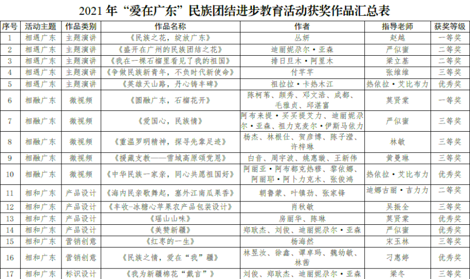 近日,广东省教育厅公布了2021年“爱在广东”民族团结进步教育活动评选结果,公司推选参赛作品获得二等奖2项。