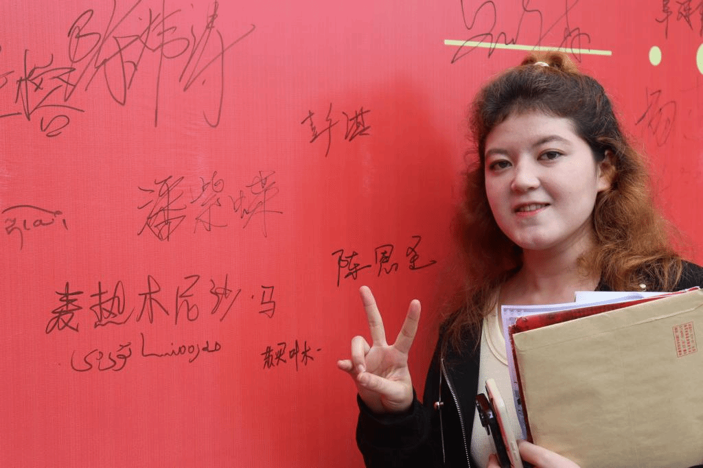 从左往右写下汉语名字,再从右往左写下维语名字,麦热木尼沙在迎新板上认真地一笔一划签名,犹如她与广师大计科院跨越五千多公里的双向约定与奔赴。