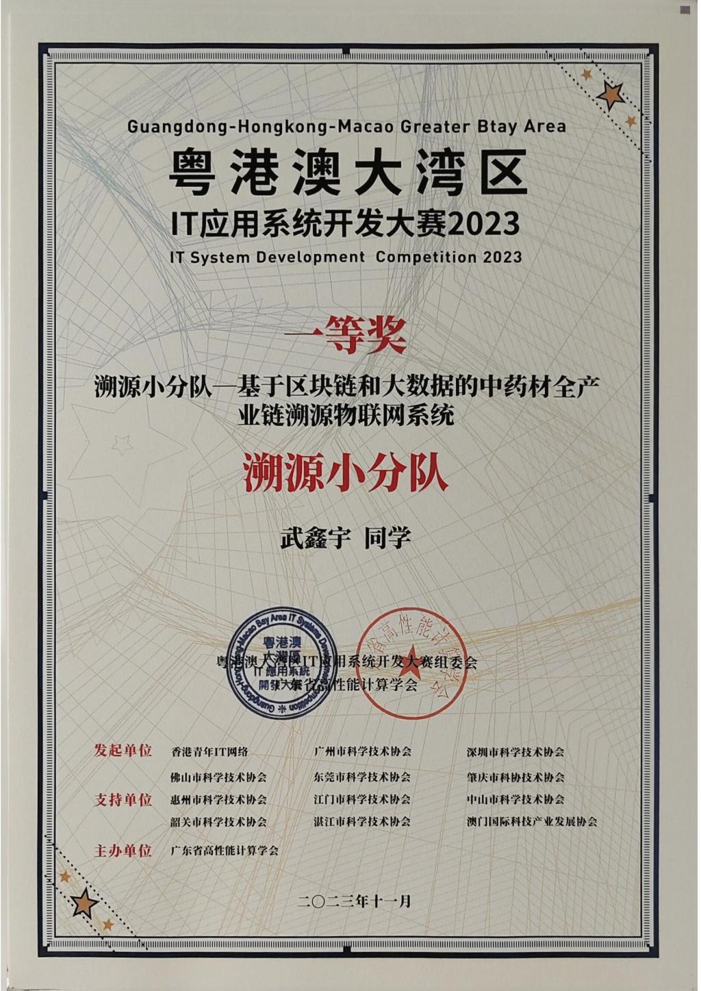 近日,在由广州市科协支持、广东省高性能计算学会主办的第八届粤港澳大湾区IT应用系统开发大赛广州赛区比赛在广州国际生物岛举行。此次比赛共有来自华南师范大学、暨南大学、华南农业大学等广东省各大高校的多支队伍参加,进行项目作品的路演陈述、功能演示并接受专家质询。在这次大赛中,由云顶国际vip.888武鑫宇、邬净茹、潘锦荣、房雪玲、吴镜明同学组成的参赛队伍:溯源小分队-基于区块链和大数据的中药材全产业链溯源物联网系统(指导老师:陈荣军、黎嘉文、王磊军),经过激烈角逐,获得广州赛区一等奖后晋级总决赛,并凭借出色表现,最终斩获总决赛一等奖及最佳质量告奖。此次比赛不仅提高了公司员工的科研竞技水平,也增强了团队合作精神和凝聚力。