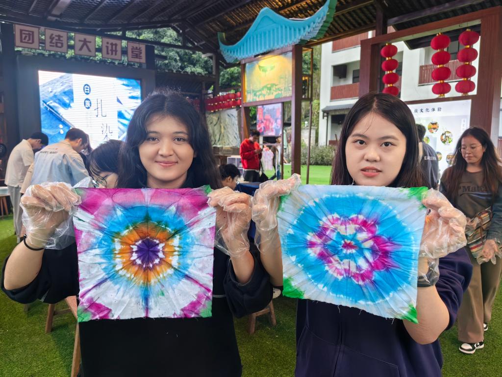 活动中,云顶国际vip8866与共工作室主持人迪娜老师在园区民族团结大讲堂中以“凝聚同心力 绘就同心圆 不断铸牢中华民族共同体意识”为主题,从“习近平总书记的民族观”、“习近平总书记追忆过的民族团结故事”以及“广师大铸牢中华民族共同体意识的具体实践”等方面进行理论宣讲。在传统文化体验环节,通过非遗扎染、白族烤茶、瑶族长鼓、佤族竹竿舞等沉浸式、体验式、互动式的活动中,各民族师生通过“看、听、学、做”的研学方式,深化了对铸牢中华民族共同体意识的认知,加深了对中华优秀传统文化的认同。2021级计算机科学与技术(师范)2班的艾则孜·斯迪克同学说:今天的活动让我感受到了中华传统文化的博大精深。第一次体验了非遗扎染的艺术,第一次体验了用维吾尔族手鼓的击打方法在瑶族长鼓上演奏的美妙。各民族的老师和同学们齐聚一堂,促进了交流,增进了情感,充满了各民族亲如一家的其乐融融氛围。